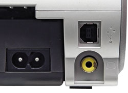 Управление принтером осуществляется при помощи всего трех кнопок, расположенных на верхней части устройства. Ниже находятся встроенный карт-ридер и приемно-падающий лоток. Лоток откидной и раздвижной, под формат бумаги 10х15. Левее, на лицевой панели принтера, находятся ИК-приемник и разъем для подключения цифровых фотокамер, поддерживающих технологию PictBridge. На обратной стороне принтера размещены: разъем питания, разъем USB и видеовыход.