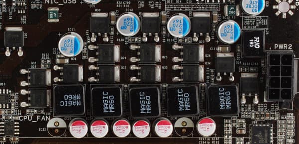 Стабилизатор напряжения питания: 5-канальный, в 4 каналах, ответственных за питание ядер, установлено по 3 полевых транзистора на канал, в канале, питающем CPU NB стоят два транзитора. Имеется 6 конденсаторов по 820 мкФ и 5 — по 270 мкФ, все конденсаторы топового класса, твердотельные. Есть возможность установки процессоров с TDP до 125 Вт. Конечно, это довольно скромная схема, которая вряд ли порадует любителей достигать стабильно высоких частот в разгоне, не исключено что таким пользователям придется организовывать дополнительное охлаждение.