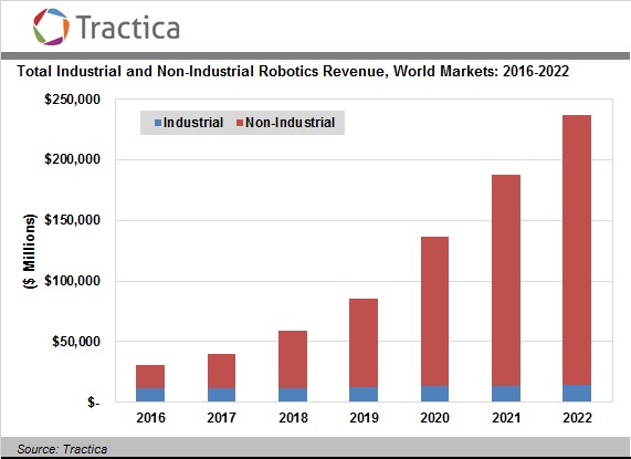 По прогнозу аналитиков Tractica, мировой рынок роботов в ближайшие годы будет быстро расти. В период с 2016 по 2022 год продажи увеличатся с 31 до 237,3 млрд долларов. При этом большая часть роста будет наблюдаться вне промышленного сегмента.