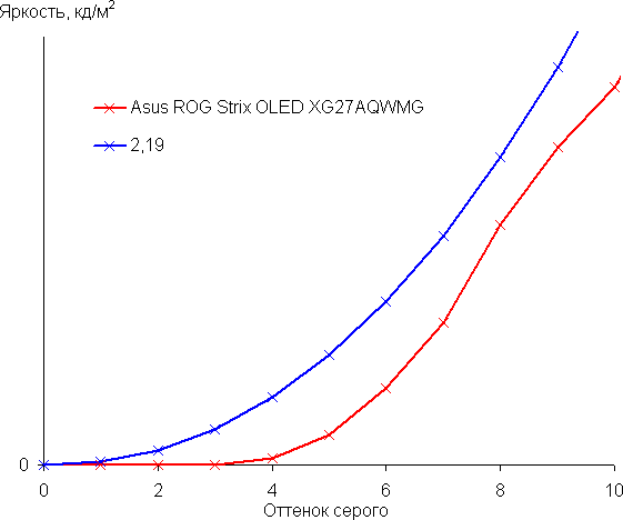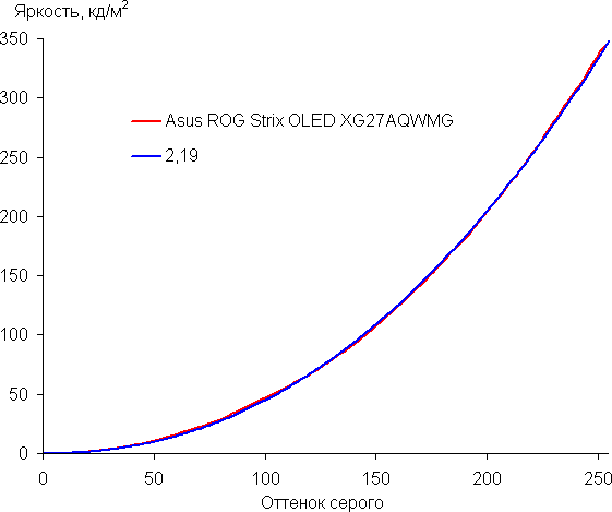 Аппроксимация полученной гамма-кривой дала показатель 2,19, что очень близко к стандартному значению 2,2. При этом аппроксимирующая степенная функция мало отклоняется от реальной гамма-кривой: