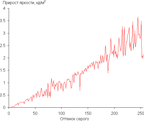 Реальная гамма-кривая ближе всего к стандартной при выборе варианта Гамма = 2.2. Для оценки характера роста яркости на шкале серого мы измерили яркость 256 оттенков серого (от 0, 0, 0 до 255, 255, 255) при значении настройки Гамма 2.2. График ниже показывает скорость изменения (не абсолютное значение!) яркости между соседними полутонами:
