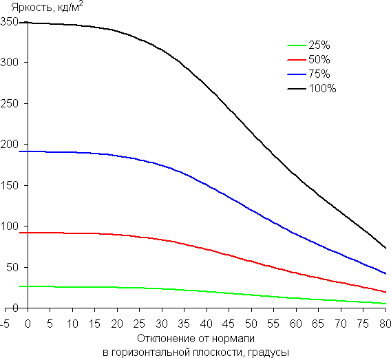 Снижение яркости на 50% от максимального значения достигается только при более чем 56 градусах отклонения. Для сравнения: в случае типичного ЖК-монитора на матрице VA яркость падает вдвое уже примерно при 35°.