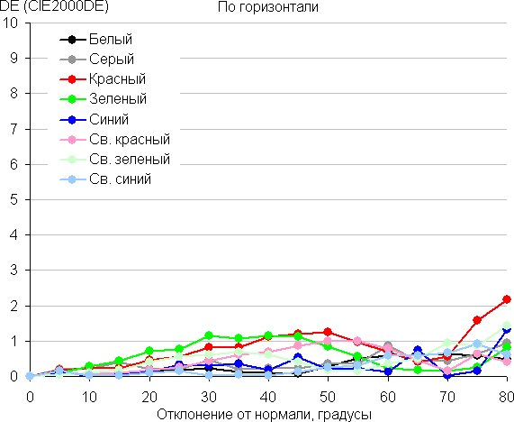 Для количественной характеристики изменения цветопередачи мы провели колориметрические измерения для белого, серого (127, 127, 127), красного, зеленого и синего, а также светло-красного, светло-зеленого и светло-синего полей во весь экран с использованием установки, подобной той, что применялась в предыдущем тесте. Измерения проводились в диапазоне углов от 0° (датчик направлен перпендикулярно к экрану) до 80° с шагом в 5°. Полученные значения интенсивностей были пересчитаны в отклонение ΔE относительно замера каждого поля при перпендикулярном положении датчика относительно экрана. Результаты представлены ниже: