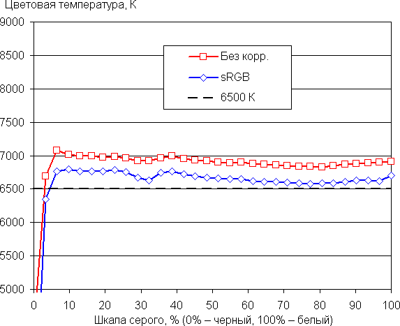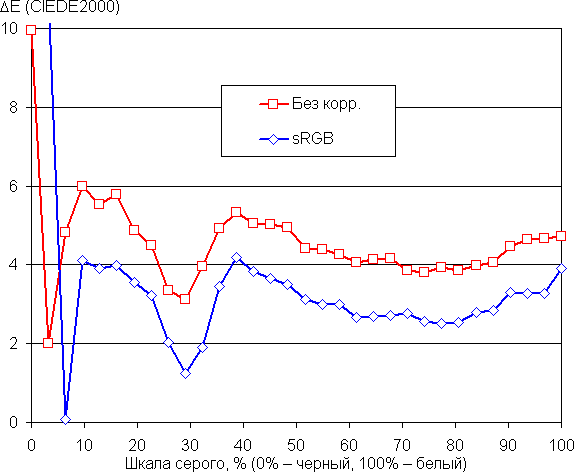 Графики ниже показывают цветовую температуру на различных участках шкалы серого и отклонение от спектра абсолютно черного тела (параметр ΔE) в случае настроек по умолчанию (подписано — Без корр.) и при выборе профиля sRGB (sRGB) также без дополнительной коррекции:
