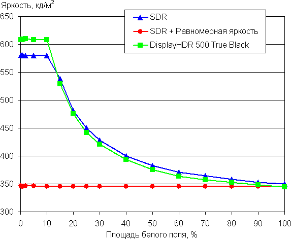 С изменением площади белого (или средней светлоты экрана) максимальная яркость также может меняться, при этом характер зависимости яркости от площади белого участка зависит как минимум от текущего режима — SDR или HDR. В случае SDR пользователь дополнительно может включить опцию Равномерная яркость, чтобы минимизировать изменение яркости в зависимости от средней светлоты экрана. Приведем зависимости яркости белого от его площади (от 0,2% до 100%) для трех режимов (в случае HDR выбран профиль DisplayHDR 500 True Black):