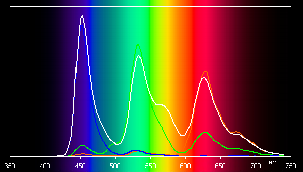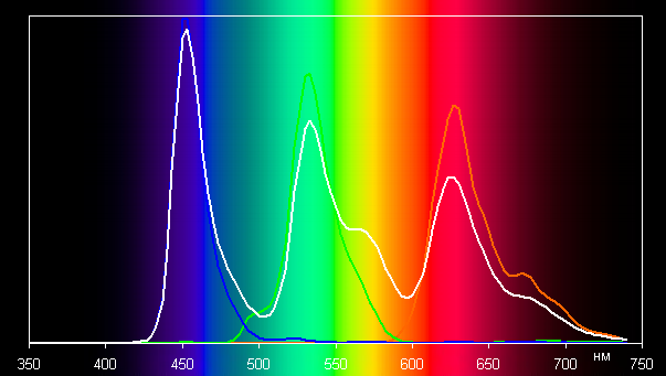 Ниже приведен спектр для белого поля (белая линия), наложенный на спектры красного, зеленого и синего полей (линии соответствующих цветов) в случае исходного цветового охвата: