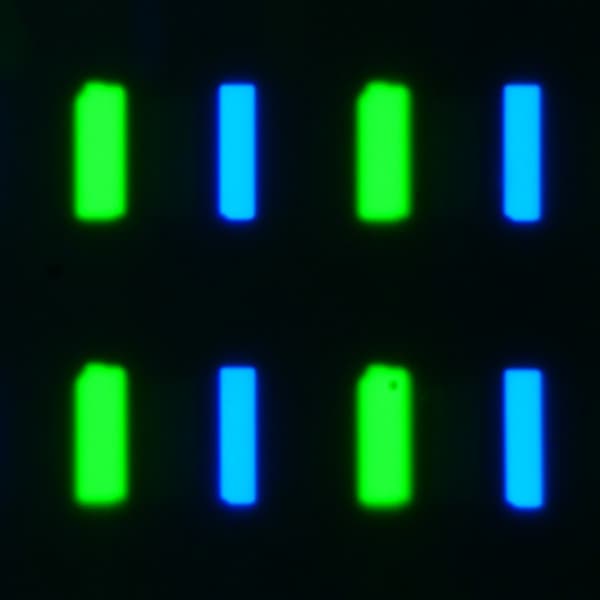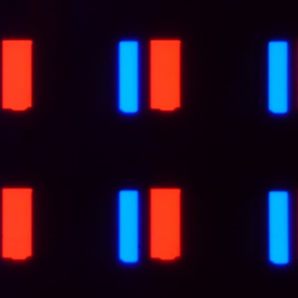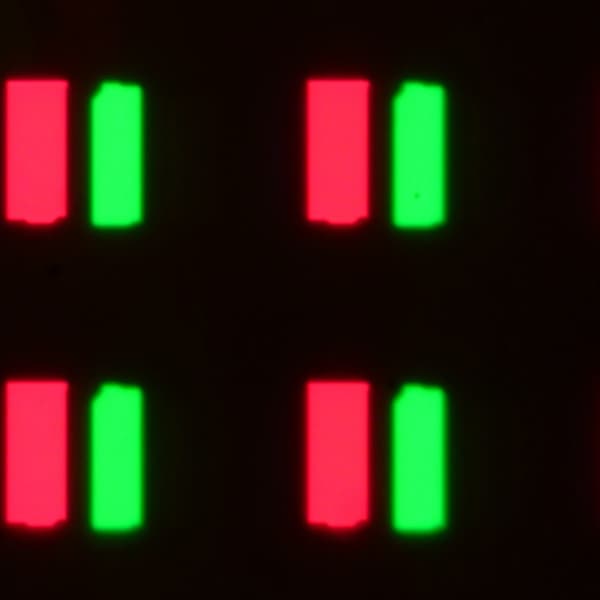 Видно, что светофильтры нанесены вертикальными полосками, как и в случае типичной ЖК-матрицы. Иное расположение субпикселей в четвертом поколении матриц дает свои плоды — мелкий текст читается гораздо лучше, чем в случае матриц WOLED предыдущего поколения, но все равно чуть хуже, чем в случае типичных ЖК-матриц.