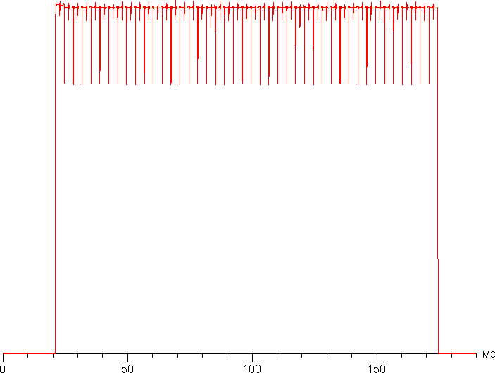 На любом уровне яркости видимое мерцание отсутствует, его не выявляет и тест на стробоскопический эффект. Регистрация зависимости яркости от времени при различных уровнях яркости выявила модуляцию яркости с очень высоким коэффициентом заполнения, что и объясняет отсутствие мерцания. В доказательство приведем графики зависимости яркости (вертикальная ось) от времени (горизонтальная ось) при различных значениях настройки Яркость в случае белого поля на 10% от площади экрана.