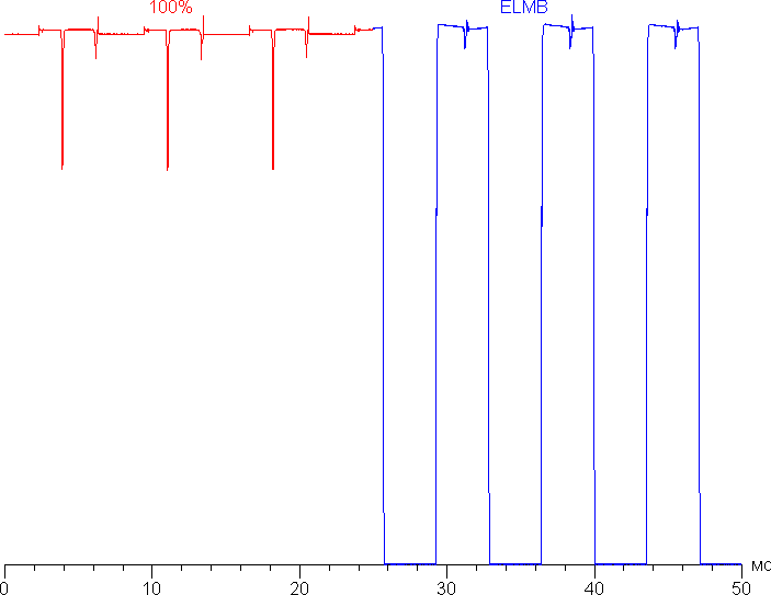 В случае сигнала 140 Гц можно включить режим со вставкой черного кадра с названием ELMB. Зависимости яркости (вертикальная ось) от времени (горизонтальная ось) в случае вывода белого поля при Яркость = 100% при выключенном и включенном режиме ELMB: