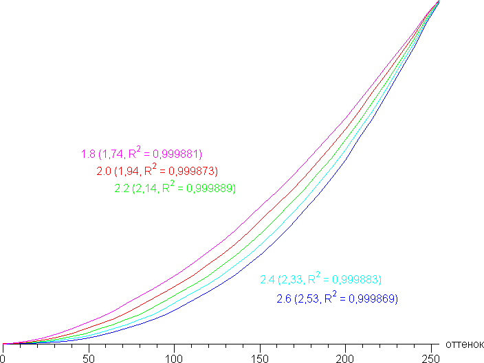 Реальная гамма-кривая зависит от выбранного значения списке Гамма. Значения показателей аппроксимирующей функции приведены в скобках в подписях, там же — коэффициент детерминации R²: