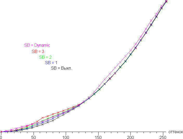 Дополнительной настройкой Shadow Boost (обозначим SB) можно скорректировать гамма-кривую, улучшая различимость деталей в тенях. Это может быть полезно в играх с темными сценами. Ниже приведены гамма-кривые при нескольких значениях SB (построенные по 33 точкам):