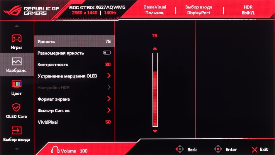 Диапазон регулировки яркости широкий. Например, в режиме SDR на белом поле площадью 10% от площади экрана (остальная площадь залита черным) при Яркость = 100 яркость составляет 348 кд/м² (опция Равномерная яркость включена), а при Яркость = 0 она снижается до 33 кд/м². Это позволяет с комфортом играть, работать и смотреть фильмы как в освещенном, так и в темном помещении. Отметим, что даже сильное снижение яркости значимого влияния на качество изображения не оказывает.