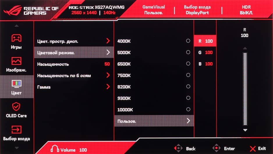 Самый близкий к черному диапазон можно не учитывать, так как в нем цветопередача не так важна, а погрешность измерения цветовых характеристик высокая. Цветовой баланс в обоих двух случаях хороший, так как цветовая температура достаточно близка к стандартным 6500 К, а ΔE ниже 10 единиц, что для потребительского (и игрового) устройства считается хорошим показателем. При этом оба параметра мало изменяются на различных участках шкалы серого, что улучшает визуальное восприятие цветового баланса.