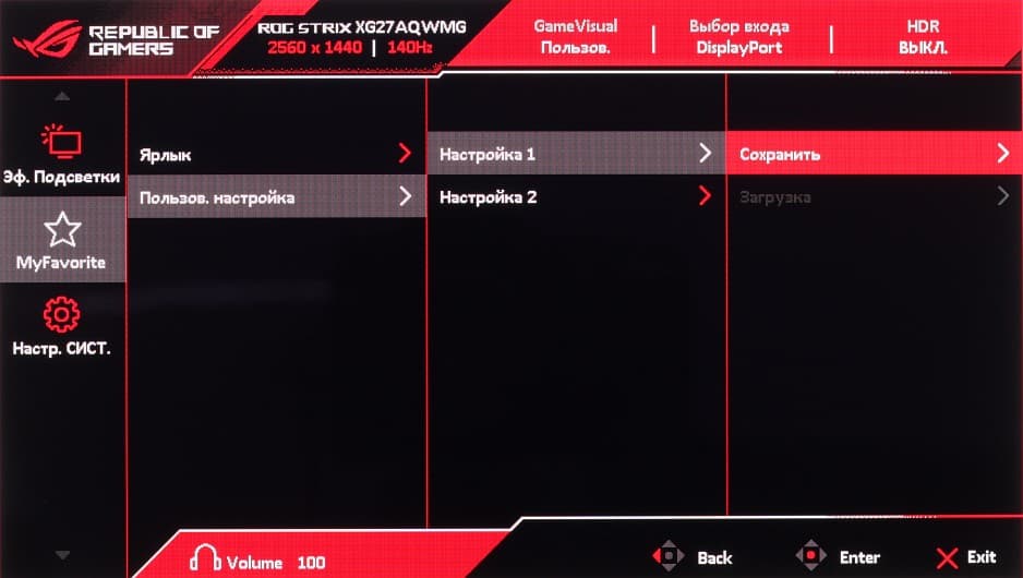 Настройки монитора можно сохранить в двух глобальных профилях.