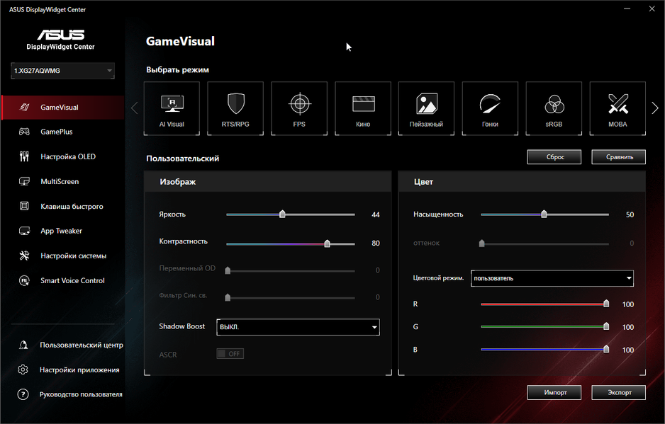 Монитором можно управлять с ПК с помощью фирменного ПО Asus DisplayWidget с развитой функциональностью.