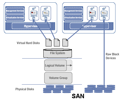 Виртуальные сервера Virtual Iron могут иметь до 16 виртуальных дисков, которые могут составлять комбинацию из логических и Raw-дисков. Raw-диски подключаются напрямую к системам хранения данных в SAN LUNs (Logical Unit Number — логические устройства дискового массива) по каналу Fibre Channel или iSCSI, используя обычный сетевой адаптер. Raw-диски обладают большим, чем логические диски, быстродействием и могут применяться для виртуальных серверов, требующих высокой скорости дискового ввода-вывода, например, серверов баз данных. Структура виртуальных дисков Virtual Iron показана далее: