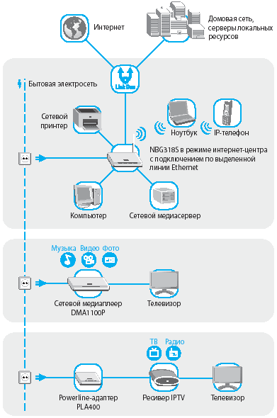 - NBG318S — интернет-центр для выделенных линий Ethernet с точкой доступа Wi-Fi 802.11g, 3-портовым коммутатором Ethernet и адаптером HomePlug AV;