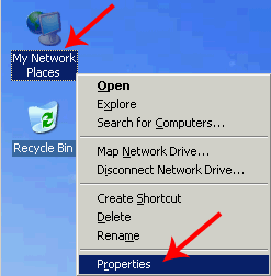 Или, если сетевое окружение (Network Places) вынесено на рабочий стол, то достаточно кликнуть по нему правой кнопкой и выбрать Properties (Свойства).