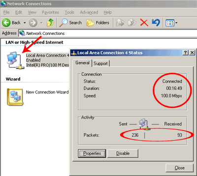 В появившемся окне выбираем нужный сетевой адаптер (обычно он там один). Новое окно сообщает нам довольно много информации. Во-первых, статус соединения (в данном случае — Connected, т.е. физическое подключение есть) и его скорость (100 Мбит). А так же количество посланных и принятых пакетов. Если кол-во принимаемых пакетов равно нулю, а в сети находится более одного компьютера (включенными), то это, возможно, указывает на неисправность нашей сетевой карты или порта коммутатора (если компьютер подключен к нему). Так же возможна неисправность самого кабеля.