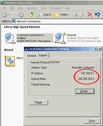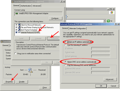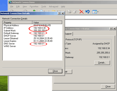 Для начала, проверим правильность установок IP-адресации у сетевой карты. По-умолчанию, ОС Windows (2K/XP) сама назначает нужные IP адреса картам, но лучше в этом убедится самим.
