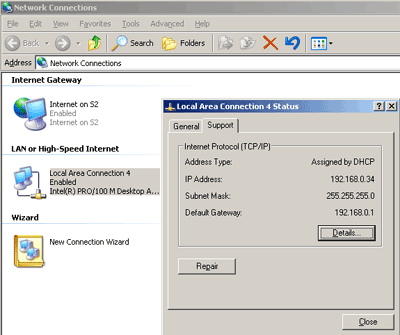 А вот как это выглядит с точки зрения остальных компьютеров локальной сети. Все они получают нужные настройки IP-адресации от маршрутизатора по DHCP. Для этого, разумеется, в настройках их сетевых карт должны стоять автоматическое получение IP адреса и DNS. Если это не было сделано, то ничего работать не будет. Настройка автоматического получения IP адреса и DNS была описана выше. Возможно, что компьютер получит нужные адреса от маршрутизатора не сразу, чтобы не ждать, можно нажать кнопку Repair, которая принудительно запросит DHCP сервис выдать нужную информацию.