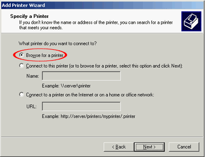 В следующем меню указываем, что хотим найти принтер в сетевом окружении. Так же можно ввести прямой UNC до принтера, например, \компьютер1принтер1, воспользовавшись пунктом Connect to this Printer.