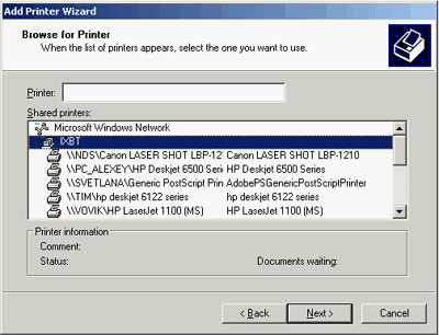 Если мы выбрали пункт поиска принтера в сетевом окружении, то после нажатия кнопки Next появится окно просмотра сетевого окружения, где и нужно выбрать расшареный принтер. После этой операции, с локальной машины можно посылать документы на печать на удаленный принтер.