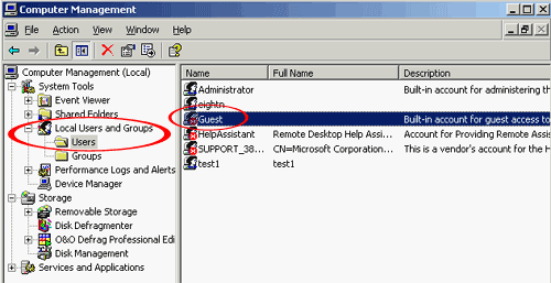 В появившемся окне управления компьютером выбираем закладку управления локальными пользоватлями и группами, находим гостевой (Guest) аккаунт и активируем его. По умолчанию в Windows гостевой аккаунт уже заведен в системе, но заблокирован.