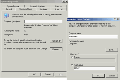 Кроме сетевых адресов, всем компьютерам нужно задать одинаковое имя рабочей группы. Это настраивается в настройках системы (System Properties). Туда можно попасть через панель управления (System —> Computer Name). Разумеется, можно задавать и разные имена рабочим группам. Это удобно, если у вас много компьютеров в сети и нужно как то логически разделить работающие машины между собой. Следствием этого станет появление нескольких рабочих групп в сетевом окружении (вместо одной).