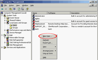 Пару слов о добавлении пользователей в систему (подробнее об этом в следующих статьях). В том же менеджере управления локальными пользователями и группами, щелкаем правой кнопкой мыши на свободном месте списка пользователей, выбираем New user (добавить нового пользователя).