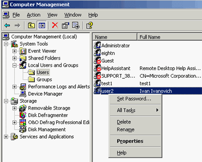 По умолчанию, вновь созданный пользользователь входит в группу Users (пользователи). Т.е. у пользователя будут довольно ограниченные права. Тем не менее, их будет довольно много и на локальном компьютере можно будет зайти под этим логином и вполне конфортно работать. Можно еще более ограничить права (до минимума) этого пользователя, выведя его из группы Users и введя в группу Guests (гости). Для этого жмем правой кнопкой мыши на пользователя, выбираем Properties (свойства),