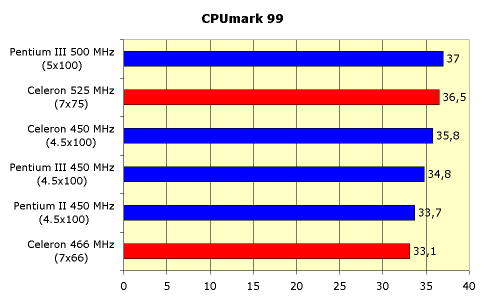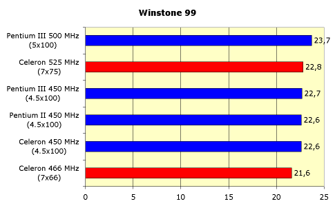 Здесь показатели еще более радостные для владельцев разогнанного Celeron 300A. Даже разогнанный Celeron 466 не дотягивает до Celeron 450, работающего с 100-мегагерцовой шиной.