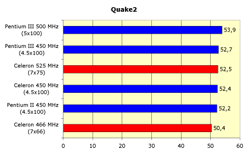 Да, мы видим все тоже небольшое отставание от 100-мегагерцовых процессоров. Вывод однозначен — скорость FSB важна и игроманам. Лишь увеличив частоту системной шины Intel Celeron 466 до 75 МГц (при этом скорость самого процессора достигла 525 МГц) мы смогли получить результаты, близкие к процессорам с частотой 450 МГц, но работающими на 100-мегагерцовой системной шине.