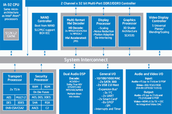 Интересно, что уже вслед за Атомом летом 2008 г. был выпущен EP80579 (Tolapai) для встраиваемых применений с ядром Pentium М, 256 КБ L2, 64-битным каналом памяти, полным набором контроллеров периферии, частотами 600–1200 МГц и потреблением 11–21 Вт. А почти сразу после него — модель Media Processor CE3100 (Canmore) для цифрового дома и развлечений: архитектура Pentium М, частота 800 МГц, 256 КБ L2, три 32-битных канала контроллера памяти, 250 МГц RISC-видеосопроцессор и два 340 МГц ядра DSP (цифровой сигнальный процессор) для аудио. Как покупались эти штуки — не ясно, т. к. после анонса о них не было слышно ничего в т. ч. и от Intel. Видимо, не очень… Уже после расцвета Атома, в сентябре 2009-го, Intel повторила попытку и выпустила CE4100, CE4130 и CE4150 (Sodaville) уже на «атомном» ядре частотой 1200 МГц, двумя 32-битными каналами DDR3, обновлённой периферией и технормой 45 нм. И вновь с тех пор об этих высокоинтегрированных системах-на-чипе (SOC) мало слышно. Может быть, рынок не готов встретить героя?