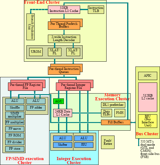 Проведя необходимую теоретическую подготовку, мы наконец-то дошли до собственно архитектуры. Её сильное упрощение позволило сократить число транзисторов в ЦП до 47 млн. (из них на ядро, включая оба кэша L1 — 13,8 млн.), а площадь — до 26 мм² (используется 45-нанометровый техпроцесс с 9 слоями медных дорожек, металлическими затворами и подзатворными диэлектриками с высокой проницаемостью). Для сравнения — 90-нанометровые Pentium М занимали 84 мм², но там вчетверо больший кэш L2. Ядро Pentium М занимает примерно 35 млн. транзисторов, а Core 2 — 50 млн. Хотя, конечно, сравнения с первым Pentium (3,3 млн.) Атом не выдерживает — совсем уж простым его назвать тоже нельзя, что косвенно видно по размеру статьи. :)