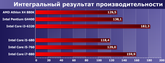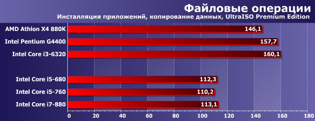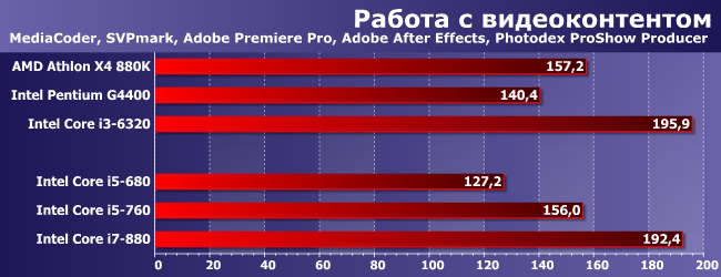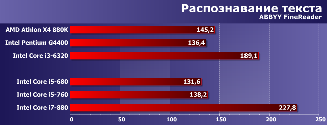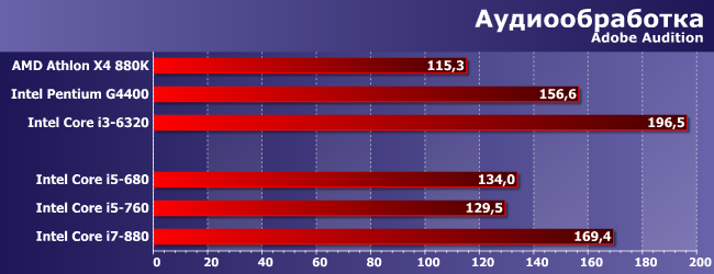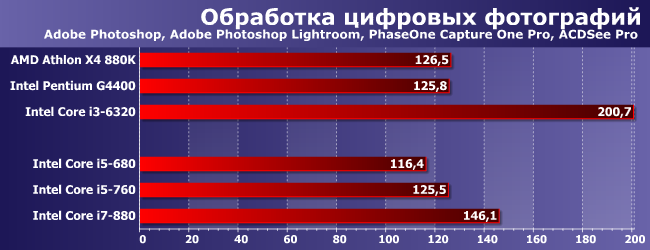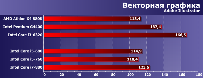С учетом того, что Pentium G4400 уже нередко обгоняет Core i3 на базе Sandy Bridge, мы не удивились его превосходству над i5-680, да и к тому, что современные Athlon X4 способны не отставать от четырехъядерных Core i5 под LGA1156 тоже были готовы на основе чуть более ранних тестирований. Впрочем, они же привели к тому, что отставание одного из лучших некогда Core i7 (кстати — такие рекомендованные цены давно уже имеют только шестиядерные модели) от банального (пусть и лучшего в линейке) Core i3 нас тоже не слишком шокировало :) А ведь эта группа приложений — тот самый случай, когда количество поддерживаемых потоков вычисления по важности сравнимо с их качеством — дальше будет только хуже.