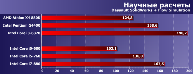 Программа более-менее способна утилизировать «дополнительные» потоки кода, но делает это не слишком активно — в итоге из «антиквариата» i5-680 оказался (благодаря тактовой частоте) хоть немного, но быстрее i5-760. А при сравнении процессоров разных поколений это всего лишь позволило Core i7-880 обогнать самый младший современный Pentium, что и вовсе в комментариях не нуждается.