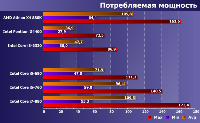 Отметим, что такие результаты получены в штатном режиме работы всех процессоров, в то время как простота разгона на устаревших платформах некоторыми пользователями (немногочисленной, но весьма голосистой группой таковых) нередко рассматривается как преимущество последних. С чем с точки зрения чистой производительности сложно поспорить — действительно: увеличение тактовой частоты увеличивает и скорость работы. Правда и энергопотребление тоже. А что с ним хотя бы в штатном режиме?