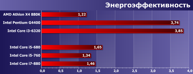 Процессоры Clarkdale/Arrandale были двухчиповыми, причем собственно «процессорный» кристалл в них изготавливался по нормам 32 нм — в результате ничего такого уж страшного Core i5-680 нам не демонстрирует. Фактически энергопотребление от системы с Core i3-2120 (при той же видеокарте и объеме памяти) отличается лишь примерно на 10 Вт, а от современных двухъядерных моделей Intel — на 20 Вт. И это лучше, чем достижения AMD на данный момент — если, конечно, оценивать только энергопотребление без привязки к производительности (о чем чуть ниже). А вот «старые» квады, еще и изготовленные по нормам 45 нм, какой-то экономичностью не отличаются — скорее, обратным. Хотя, опять же, положение сопоставимо с процессорами для FM2+, но это сравнение из разряда «оба хуже» на фоне современных платформ Intel. И понятно, что разгон может только усугубить дело. Хотя кого не беспокоит такой уровень энергопотребления, тот и от его увеличения уже вряд ли сильно расстроится.