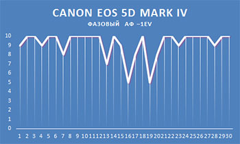 По диаграммам мы видим очень достойную работу автофокуса Canon EOS 5D Mark IV. Камера, как правило, фокусируется точно, хотя иногда промахивается — в отличие от флагманов Canon и Nikon, которые не промахиваются почти никогда. Но все-таки средняя точность порядка 9 баллов из 10 возможных — это очень хороший результат, которым может похвастаться далеко не каждая зеркалка.