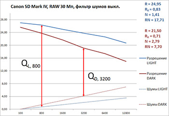 Но в итоге мы получили характеристики Canon EOS 5D Mark IV. Она при более высоком разрешении обгоняет Nikon D610 по шумам, то есть шумит слабее. И хотя по шумам отстает от Canon EOS 1D X Mark II (шумит сильнее), но по разрешению заметно выигрывает у флагмана Canon.