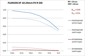 Разрешение в диапазоне f/4—f/16 в центре кадра — высокое и очень высокое (снижается от 0,95 линии на пиксель до 0,7 линии), но на закрытой диафрагме падает до 0,5 линии. Разрешение на краю кадра заметно отстает от разрешения в центре, но все равно остается высоким в диапазоне f/4—f/16. Хроматические аберрации заметны только на краю кадра на широкой диафрагме, а начиная с f/11 становятся почти незаметны. В центре кадра «хроматика» почти не видна во всем диапазоне диафрагм.