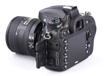 Для разъемов организована сложная система крышек. Сверху она закрывает аудиовход и аудиовыход (оба стерео, мини-джек 3,5 мм). В средней секции — mini-USB и mini-HDMI (тип D). В нижней секции — разъем для аксессуаров (GPS GP-1, кабель ДУ Nikon MC-DC2 Remote Cord и другие). |