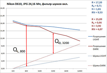 Для высокой чувствительности мы не высчитываем уровень шумов. В принципе это возможно, но особого смысла в этом нет. Пока мы создали универсальную методику оценки уровня шумов для диапазона ISO 100 — 6400. Для некоторых фотокамер этот диапазон рабочий, для некоторых — «почти рабочий». А то, что лежит за его пределами — это, скажем так, фотографическая экзотика.