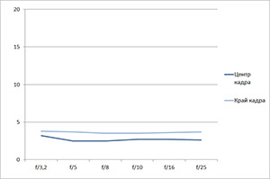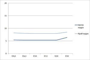 На этом фоне узкая диафрагма f/22 дает лучший результат — порядка 0,6 линии на пиксель. А край кадра во всем диапазоне отстает от центра примерно на 0,1 (это обычная картина для большинства объективов).