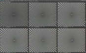 И, наконец, на длинном фокусе мы опять видим «вертикальную подушку» (Dвер = 2,86 и Dгор = 0,84). Она чуть меньше, чем на среднем фокусном расстоянии, но весьма заметна. Разрешение чуть падает, но в центре остается высоким (0,6 — 0,8 линии на пиксель), а на краю — не очень высоким (0,45 — 0,65 линии).