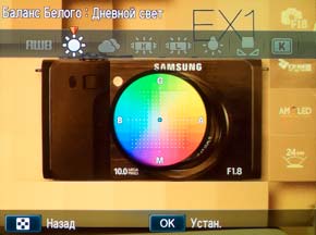 | Выбор варианта стилизации снимка по цвету. Работает как при съемке, так и при просмотре. Можно обработать RAW-снимок и сохранить его как JPEG 5 Мп. | Ручная настройка цветопередачи на снимке. |