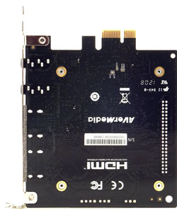 На карте имеется четыре разъема: два HDMI (вход и выход) и два аналоговых аудиоразъема (также вход и выход). Электроника на печатной плате накрыта металлической пластиной, приподнятой на болтах-стойках. По всей видимости, никаких функций, кроме защитно-декоративных, эта пластина не выполняет.