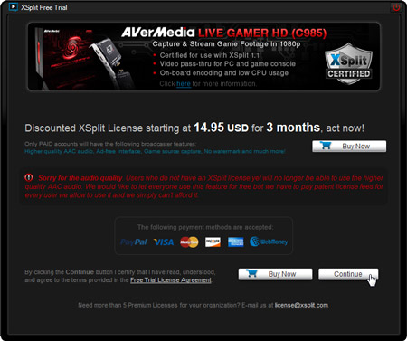 Рассматриваемая карта захвата, в отличие от подавляющего большинства аппаратных кодировщиков, может работать не только с прилагаемым ПО. Правда, речь не идет о любом стороннем программном обеспечении. Наша карта поддерживается еще одной — лишь одной — программой, которая «широко известна в узких кругах». Речь об XSplit Broadcaster, программе, позволяющей вести трансляцию видео в интернет. К сожалению, полноценная работа с этим приложением является платной, хотя в целях тестирования можно ограничиться и trial-режимом (впрочем, в комплекте с LiveGamerHD имеется также активационный код на трёхмесячную Premium-лицензию Xsplit).