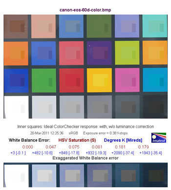 Средняя строчка цифр показывает нам численную оценку ошибки баланса белого в единицах цветового пространства HSV. Так, цифры красного цвета обозначают ошибку по координате S — saturation (насыщенность), цифры синего цвета — в градусах Кельвина [Миредах (Mireds)]. При значении S<0,02 (речь идет об ошибке по координате S в HSV), ошибка практически незаметна, а при ошибке S>0,10 она видна, особенно на нейтральных полях большой яркости.